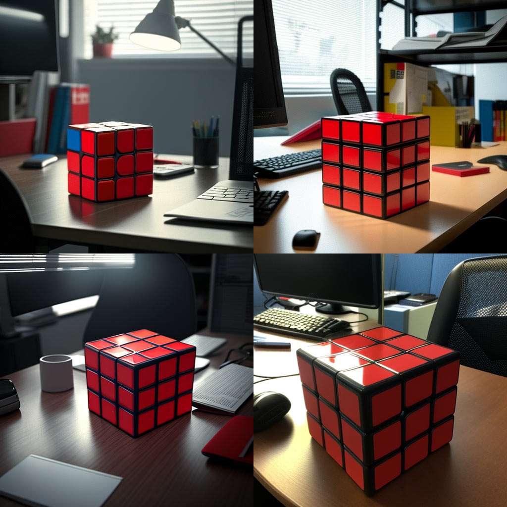 Midjourney generated these images on this prompt: red rubik's cube, red on all sides, 3 squares per side, on an office table, sharp overhead light