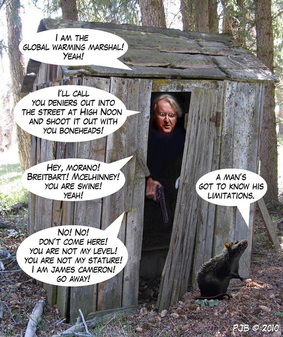 “These comrades betrayed us. See what's happening. Comrade James Cameron gave us hope when he called the fascist global warming deniers out into the street. Progressives were standing ready in Aspen but Cameron chickened out and ran. Now the reactionary mob is running rampant. The swine Marc Morano is laughing at us. His disgusting Climate Depot mocks our most sacred symbols while Gore and Cameron hide in their compounds. It's a planetary disaster.”