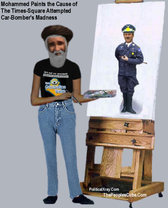 Mohammed was a Bush Basher? I see you have him painting the Bushitler with a moustache of Hitler in a kind of a Blue Nazi uniform, and Mohammed is wearing a T-shirt that says: Iraq Occupation Watch, or something like that, and titled "Mohammed Paints the Cause of the Times Square Attempted Bomber's Madness."