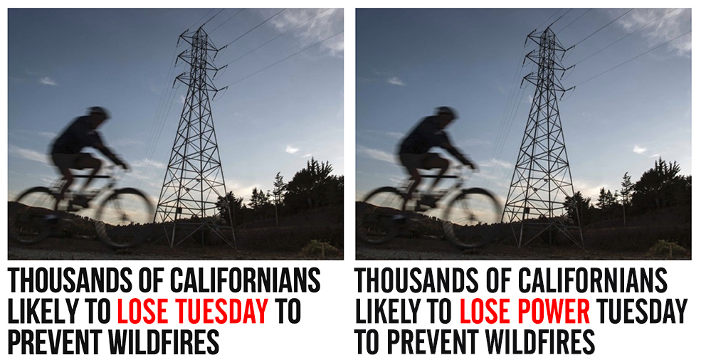 This one is a bit different because it errs by omitting the crucial word, power, falsely making it appear that Californians will lose Tuesday. (Oh, no! Not the glorious world of next Tuesday!)