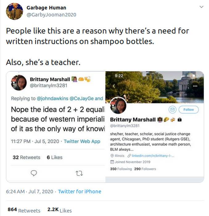 Antonio Salazarinski wrote:Brittany Marshall, a BLM Teacher has stated that 2+2 only = 4 because of “Western Imperialism!”