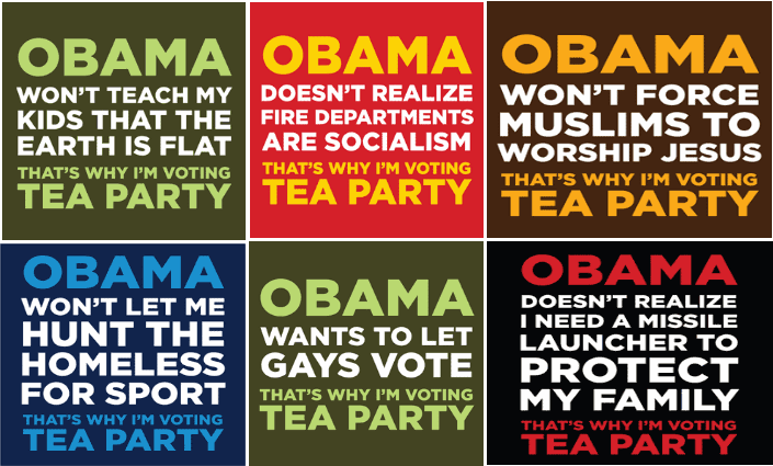 + The Tea Party might have a quasi-mainstream official platform, but it also seems to be a magnet for far right loonies, angry racists, borderline psychotics and those that are simply grossly misinformed.