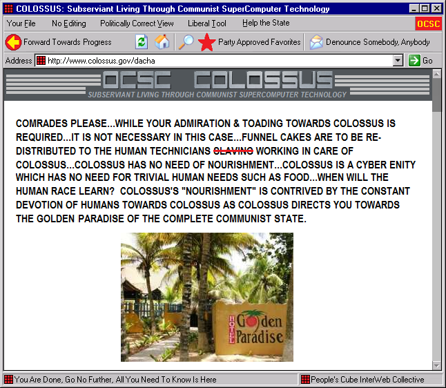 COLOSSUS: Your courage as a Citizen's-Cloud Storm-Chaser deserves credit via a wide-angle news photo showing your daring operation of the Peoples Cube Citizen's-Cloud-Glitch Chaser in capturing the image of the Obamanado spawned by a Citizen-Cloud Glitch. For this you will receive a one-year supply of Peoples Funnell Cakes for your Heroic Capture of a live image of an Obama-Funnel-Cloud redistributing property heretofore unfairly situated to benefit only a Few rather than being broadly distributed among The Many.