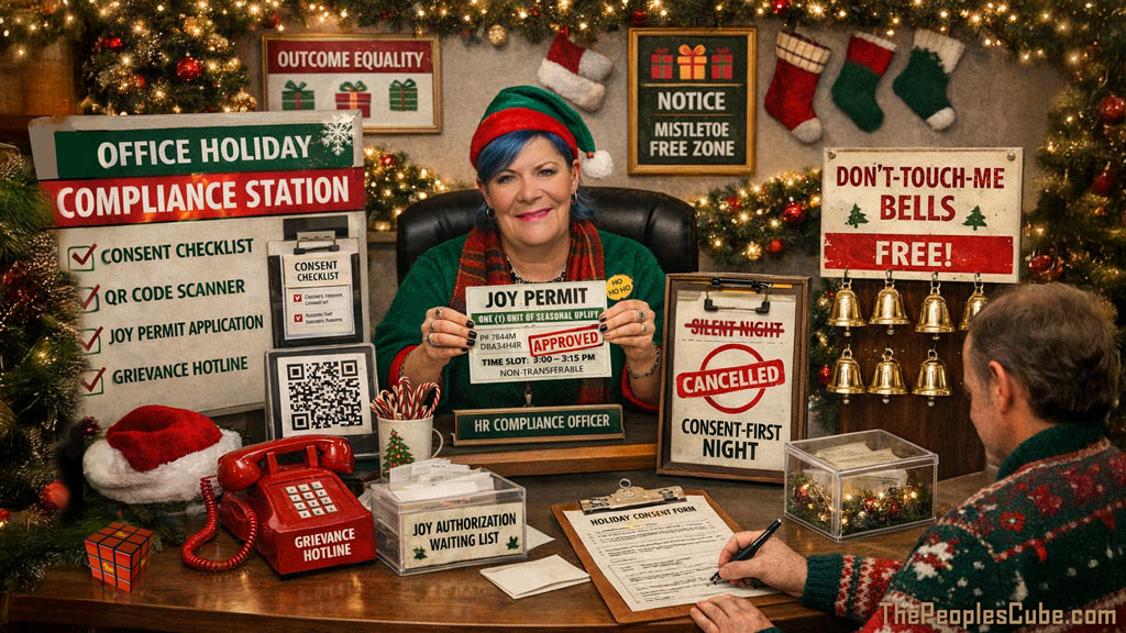 Holiday parties are also being updated for maximum inclusion. Gifts must be identical to avoid outcome disparities, and the eggnog comes with a warning label for "unexpected joy." Employees are encouraged to submit their preferred holiday greeting in advance so the company can select the safest option, likely: "We acknowledge this season is complex."