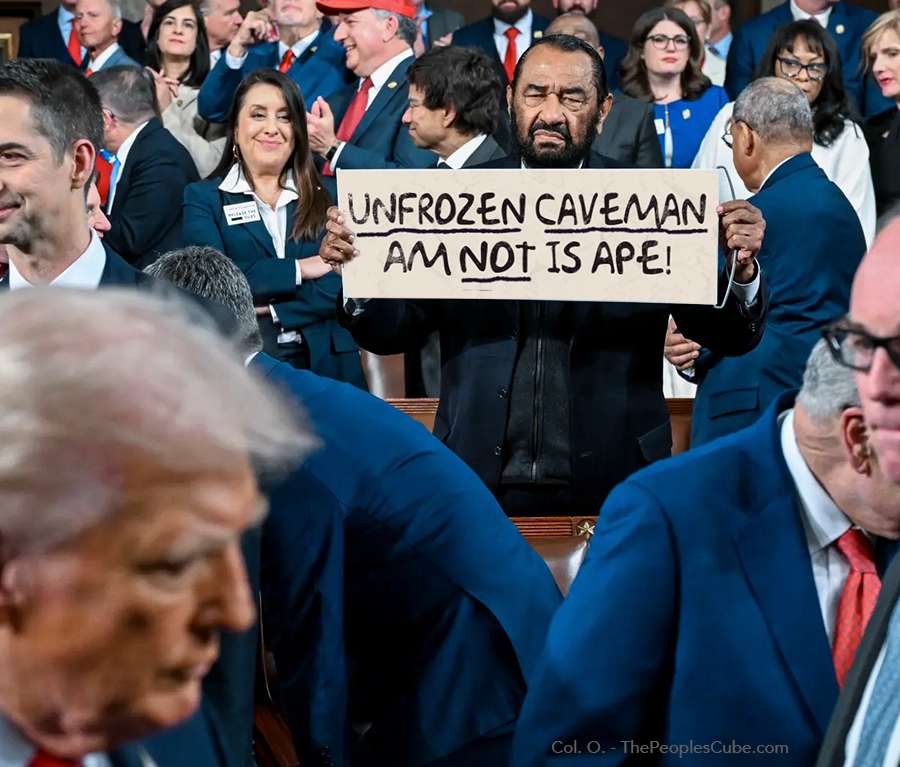 Less ironic but just as dimwitted, the only unfrozen caveman lawyer in Congress, Rep. Al Green (TX-D), who got bounced from last year's SOTU for disruptive behavior, showed up last night to agitate again with a gaslighting banner. He was booted out of the chamber once more.