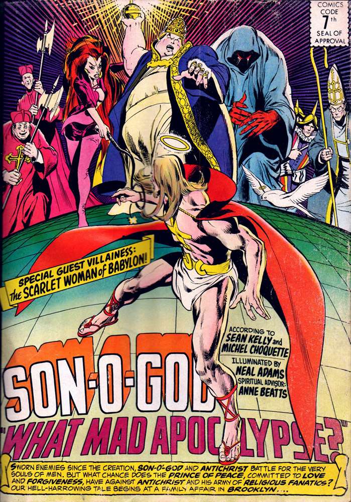 Splash page of Sean Kelly's "Son-o-God" comics, depicting Jesus as a superhero, published at The National Lampoon. (Art by Neal Adams)
