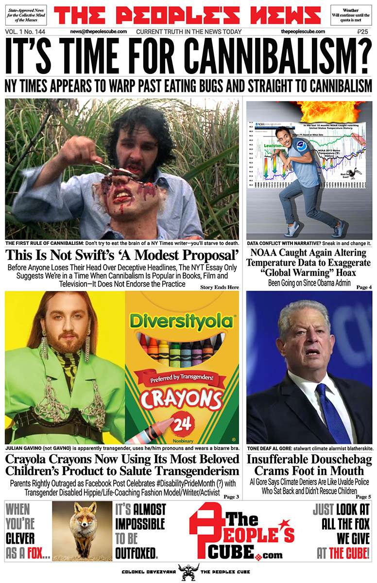 EDITOR'S NOTE: Much as I loathe the New York Times, I have read (and have a transcript of) its piece, "A Taste for Cannibalism?" by Alex Beggs. It is a commentary on fictional cannibalism in contemporary literature, film and television that does not—at any point or in any way—endorse cannibalism or suggest the practice be adopted.